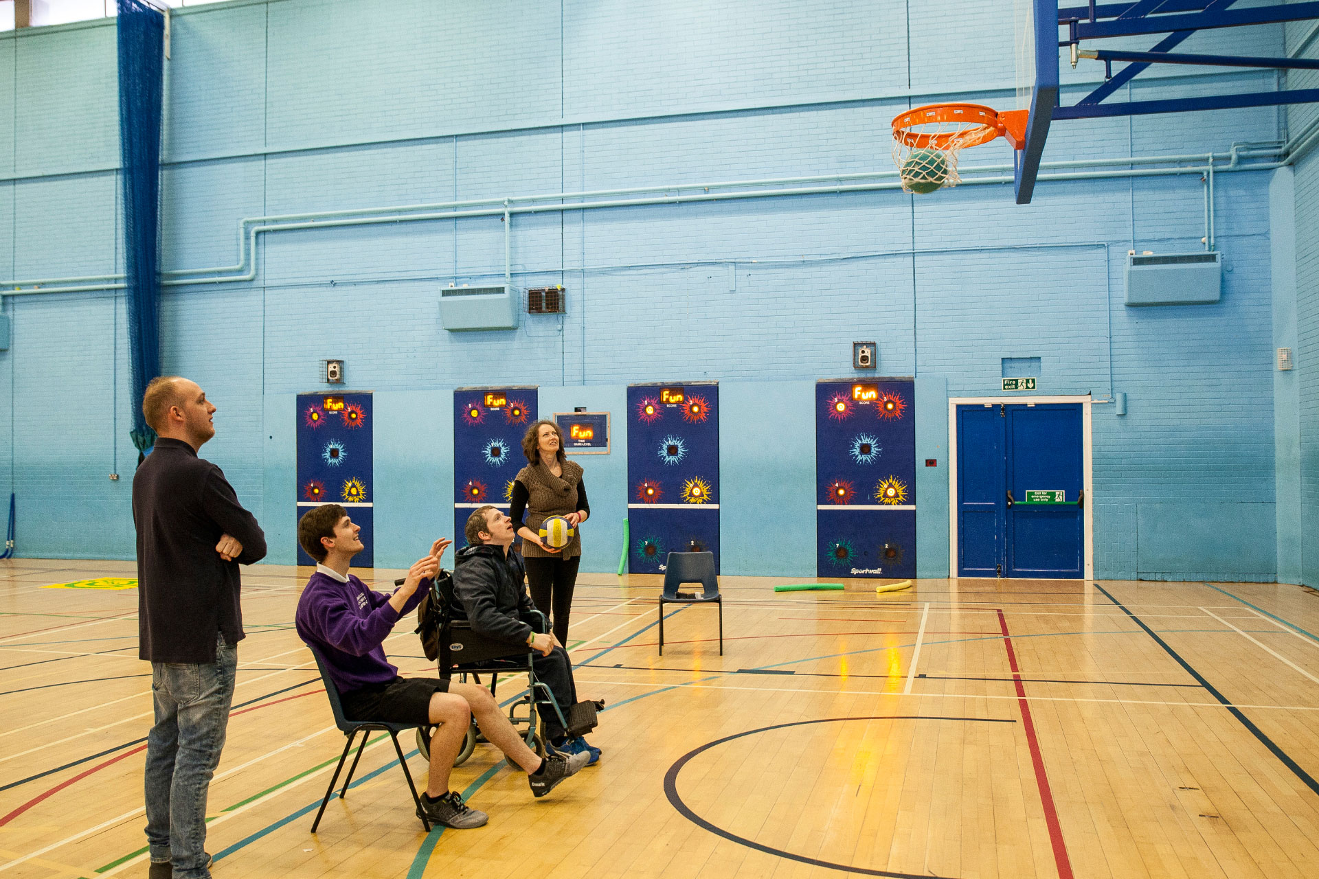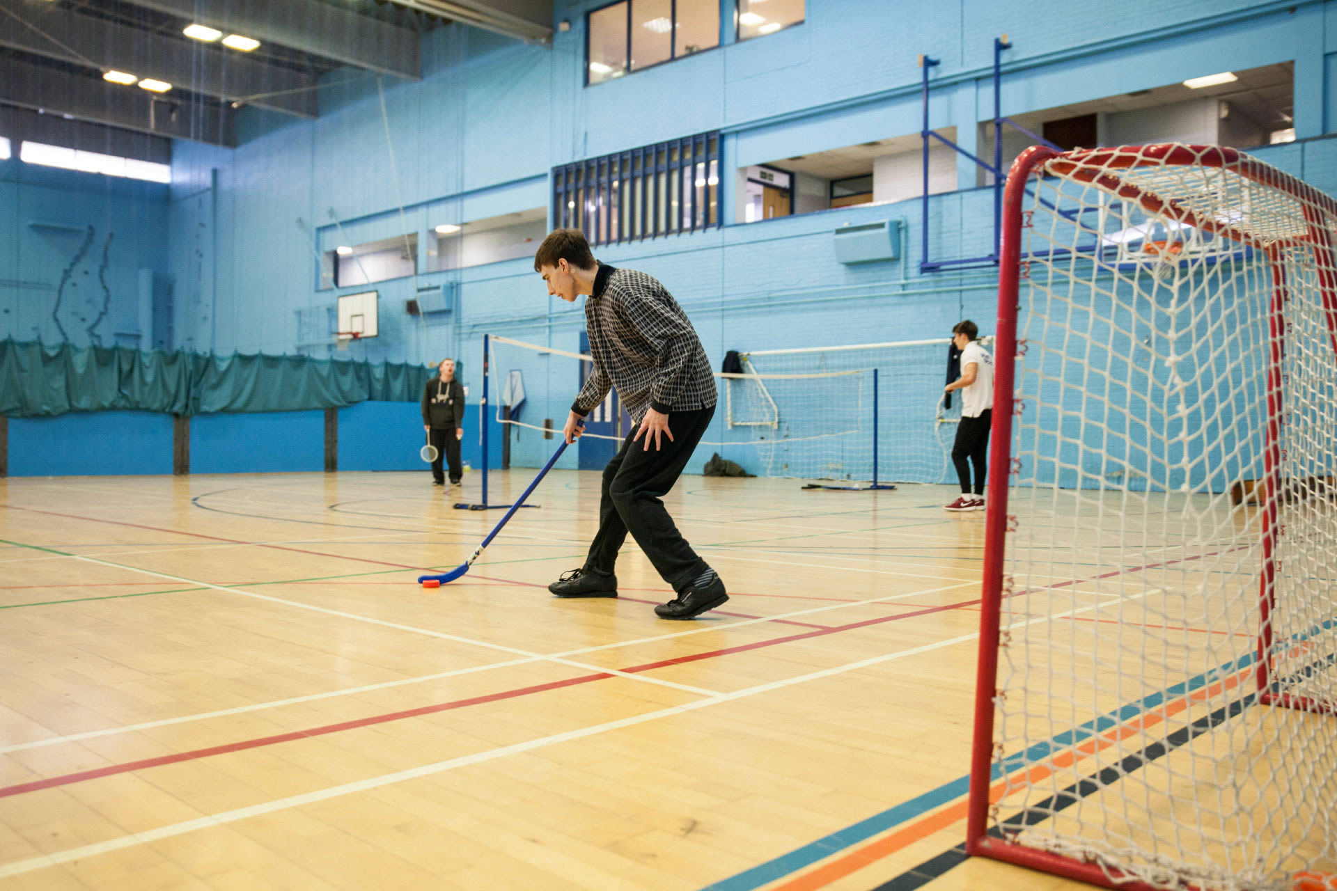 The hall has floor markings for badminton, volleyball, basketball and 5-a-side football with nets, goals and hoops available.